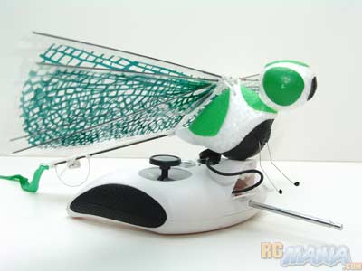 This is certainly one of the more unique RCs I've seen yet. What can I say? It's... really interesting! It has little feet up front, brightly glowing eyes, a soft, bulbous body (don't try squeezing it too much though), a helicopter-like tail rotor (propeller), and of course, four insect-like translucent wings! The wings have stiff struts going through them, but most of the surface area is a single layer of thin, very flexible plastic. Two sets of wings are included, one with a robotic circuit board design, and then the more life-like green veins set shown above. The controller looks like something for a video game, and it's somewhat large (smaller children beware), but feels very well-built and high quality.