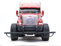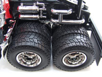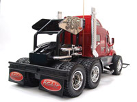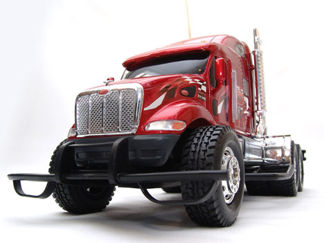 Good-performing RC semi trucks are hard to find, but this looks like a winner from the outside. It seems pretty tough with oversized bumpers and a huge roll cage, yet it's still pretty lightweight. It has semi-pneumatic rubber tires that are wide and soft. The truck has nice detail, including real chrome wheels and accents and candy-apple paint. The included battery is New Bright specific, but there is also an industry-standard standard "Tamiya" plug that lets you run normal 9.6V rechargeable packs.